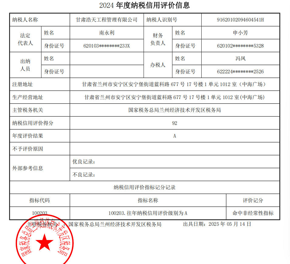 甘肅浩天工程管理有限公司榮獲2024年度“納稅信用等級(jí)A級(jí)納稅人”稱號(hào)
